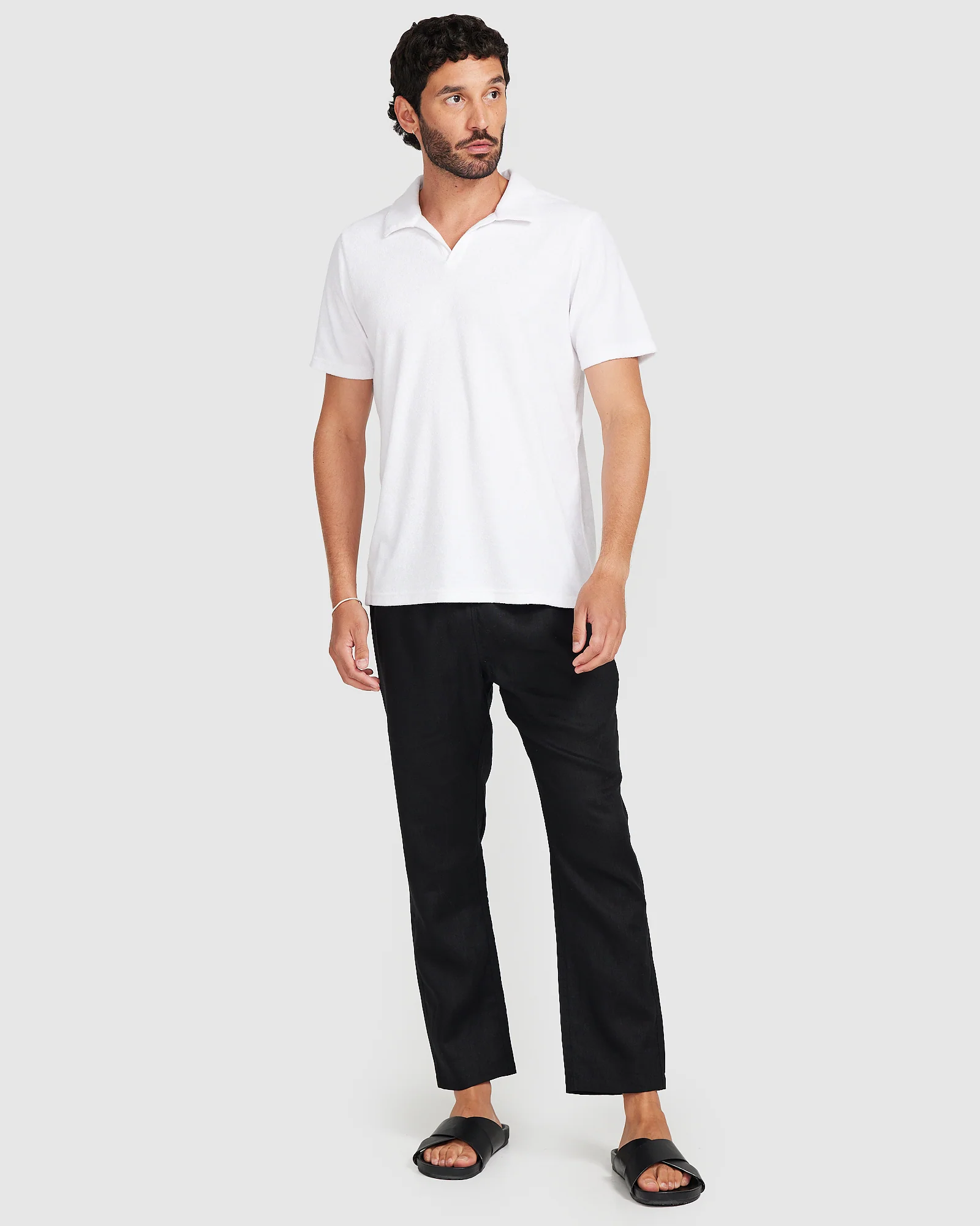 The Terry Towel Polo in White is a practical piece for any vacay escape. Cut for a relaxed fit from 100% cotton terry towelling, this shirt is a short-sleeve polo style made for those warmer days. Wear it with everything from swim shorts to linen pants.